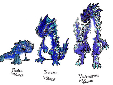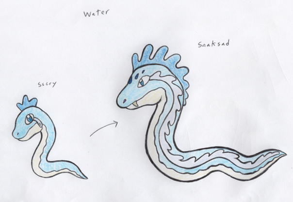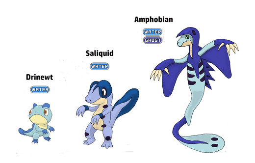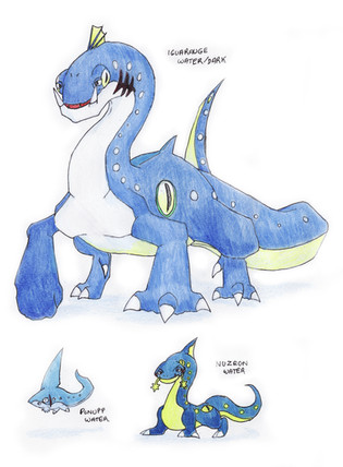 The last batch of starters...Water-type, of course. It gets sort of tough trying to color with one main...color. Oh well, can't be helped. Water-types are blue, and these guys are big. They went through many design changes; the second-stage was at one point the final stage, but it just didn't look right. Ah, look at me ramble.~~~~
