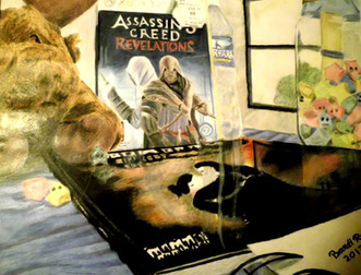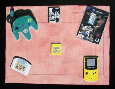 School project. For a class called Drawing on a Theme. I choose my theme to be centered things I do in my free time. I also wanted to further explore using pastels and taking them to a different level than I do with my regular illustrations. I also choose to do this because a lot of teachers don't know that I can actually draw rather well. They'll sometimes ask me to limit myself or question if I really can pull something off. I just choose to work really stylistically.This is the first piece of the series. I do enjoy me some video games. Man the scan totally does not do this piece justice. The reds are suppose to a bit more vibrant and so are some of the blues.