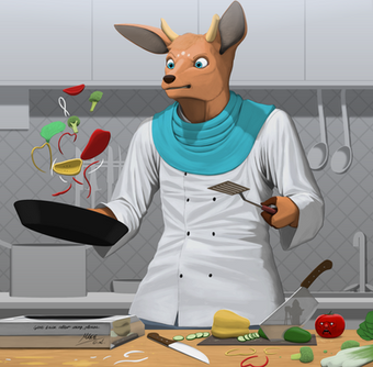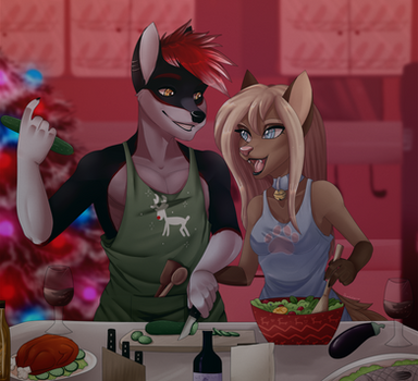 Wow, I hadn't posted this yet. O.O This is a gorgeous joint commission that my dear friend and I got from the fabulously talented ! Bahati and I have had many long talks, and one of the things we've talked about many times is that one day when we get to visit eachother, she's gonna show me how to make a proper steak (a skill I just do not possess lol ). So, we had to get our characters in the kitchen.