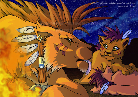 I was doing a scrub through of my commissions from over the years when it struck me that I haven't uploaded this. o.o Not sure how I missed it! This is an absolutely gorgeous commission from the fantastically talented that I got about 5 years ago. :3 Featured here of course are my Lu and the every handsome Red XIII, swapping stories around a small fire.