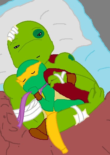i think it would be cool if it was mikey he was holding whaen he got hit by the something.