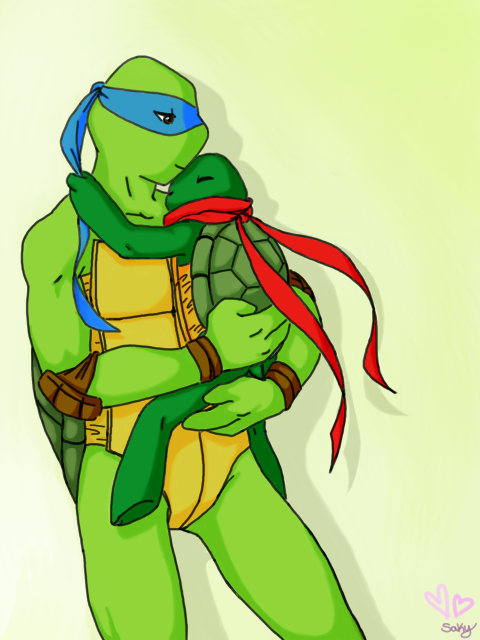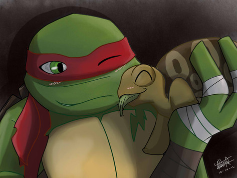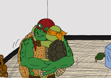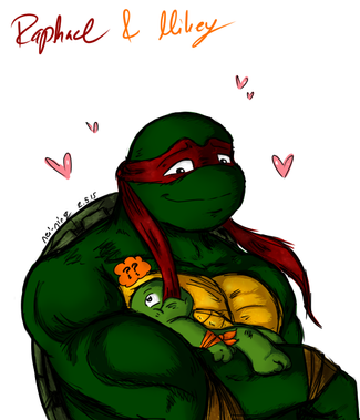 This doodle dropped down on me from nowhere, and I know poor Raph is completely out of caracter. First I tried to picture him as a dad, but I rather think he would be scared out of his wits..This little turtle looks familiar and safe to him, like a little brother more than his actual child.. Maybe Mikey was hit by a antiaging lazer or something.. Or maybe I just like to read too much into things that are not there..