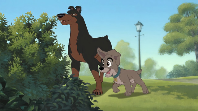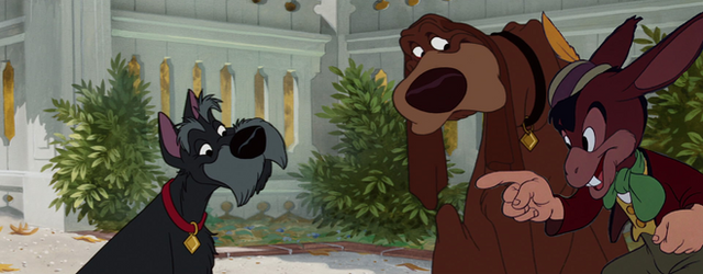 After successfully getting into the zoo and almost being crushed by a falling tree, the trio meets a beaver trying to move a log to a leaky dam. Tramp sees the beaver struggling to move the log and gets the idea to advertise lady's muzzle as a log puller and gives the beaver a run down on how to use it. The beaver is ultimately impressed by the muzzle and asks if there is a price. Lady replies with "it's a free sample." Bewildered and excited by this comment, the beaver chews the muzzle off lady and begins using it while the trio make their way back out of the zoo.© original by Disney