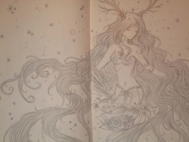 Whoa, I love this! Just look at those details in the branches. It really reminds me of actual trees and I really love the time and care you took to draw all those intricate ribbons and petals that all blow to the same direction. I'm not familiar with the deity that you have drawn but they look ethereal even without the fancy effects of digital painting