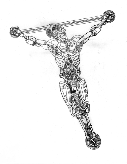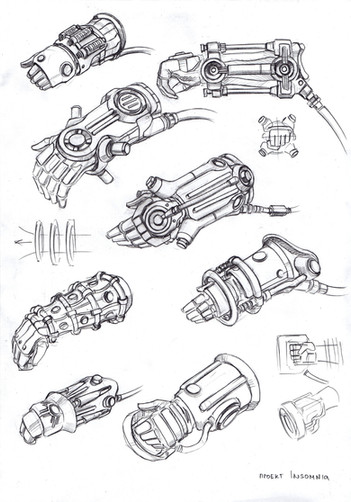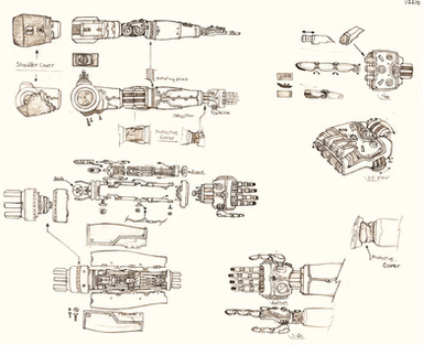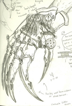 The Particle Projection Sidearm -- also called the "Tesla Gauntlet" (or just "The Gauntlet") -- is exactly what it sounds like: a miniaturized charged particle beam projector (based loosely on Tesla's rumored "teleforce" death ray [ gizmodo.com/5587182/why-teslas… ]) wearable on one's arm via this fashionable gauntlet. It's a fictional weapon created for early drafts of "The Edge of Chaos"; whether I'll include it in the final story is something I'm still debating.Some notes from the drawing: