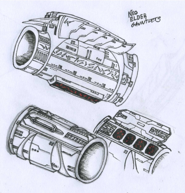 * The "system display" would've had basic information such as the date and time, how much energy the device had left, and how many more blasts of different types (I had conceived of the device as being able to shoot one continuous particle beam, short particle bursts, or a wide-area "net" of lightning) the wearer would be capable of using before the device either ran out of energy or burnt out entirely. Since smartphones and tablets have become the norm, maybe the thing could have a smart computer with its own separate power supply built in?