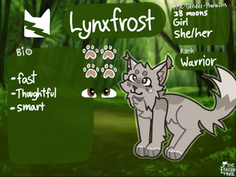 :: Written Appearance: Frogpaw is a long, messy furred she-cat with green eyes and darker splotches on her back, and face, along with a tiny black tail.