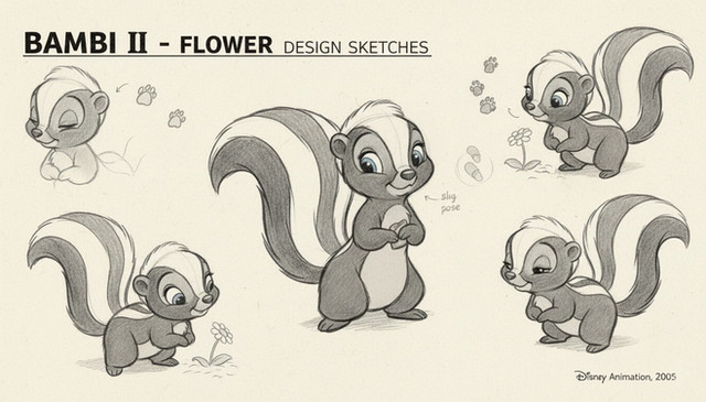 Flower is my favorite character in Bambi- hopefully I did him justice. I took a lot of inspiration from the way Ken Hultgren drew him in a comic called "Hibernatin' Trouble".It's a little tricky drawing Flower without making him look like a girl. Not sure even the Disney animators managed that 100% of the time.