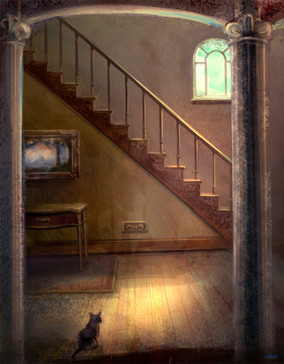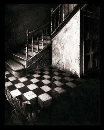 What an eerie picture...its almost detailed enough to be a photograph. The lack of color adds to the unsettling feeling, and the style of the house is exactly what you would expect in a 'haunted house' for lack of a better word. I loved the mysterious figure on the stairs... you can almost make out a face on its head. The lighting is incredible too...doing such detailed lighting in shades of grey is no easy feat. I'm quite impressed.