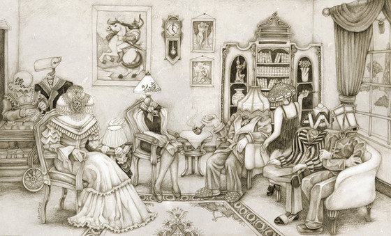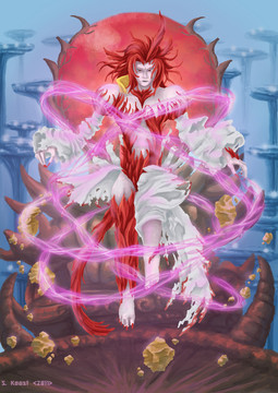 Basically, I made him an extremely vain devil who was obsessed with making everything in the world beautiful. Only he was completely mad and his sense of beauty was bizarre. He was also basically fashion obsessed and dressed himself in bright colors that made him look like an exotic bird looking for a mate (the peacock feathers reinforced that).