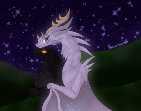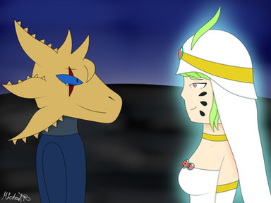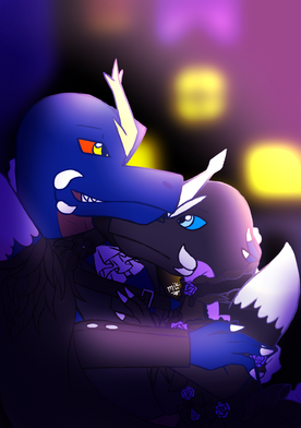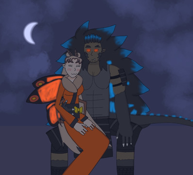 Also things to note, this takes place after the events of Hollow Earth in my story. Mothra got more scars from that event and Godzilla has pink hair. This is also after Gojira comes back as Kiryu. The crystal Godzilla used was shattered in that fight, however it ended up leaving his hair pink at the tips and his eyes having 2 colors. So it is some time, a year to be exact. This is around the time the twins should be born. Also idk what they are doing here. They might've went to a nice place with a real high balcony, probably out with friends too. Also yes I did make Mothra shorter now. She'll be 6.2 feet now. She's as tall as Barb now. I just didn't like her being almost as tall as Goji.