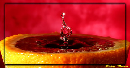I like the oval shape of the drop very much. It's quite unique. And the little green reflection in it. Very imaginative use of complementary colors.