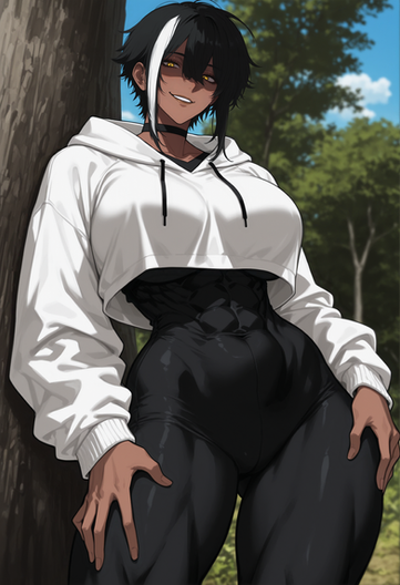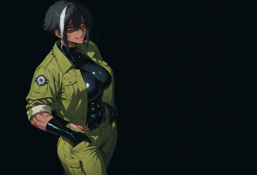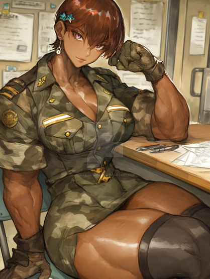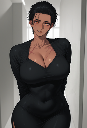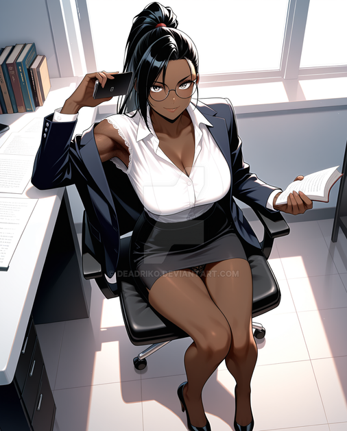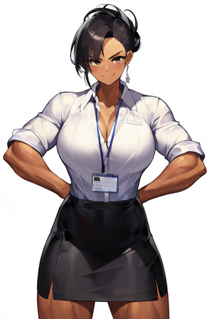 #digitalart #fanart #characterdesign #blackhair #cleavage #clipboard #darkskin #glasses #jacket #largebreasts #maturewoman #muscular #officelady #pencilskirt #pixiecut #scars #shirt #shorthair #simplebackground #woman #wristwatch #yelloweyes #1girl #widehips #muscularwoman #thickthighs #thinwaist #hairbetweeneyes