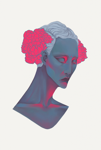 Wow. The combination of beauty and deprecation is really nicely done in this one. The contrast of the pink in the flowers with the pale greyish blue of the face is also really well done.