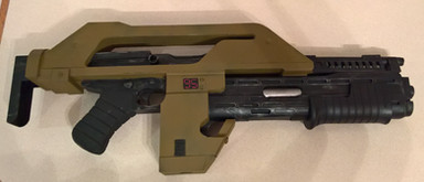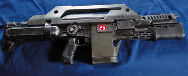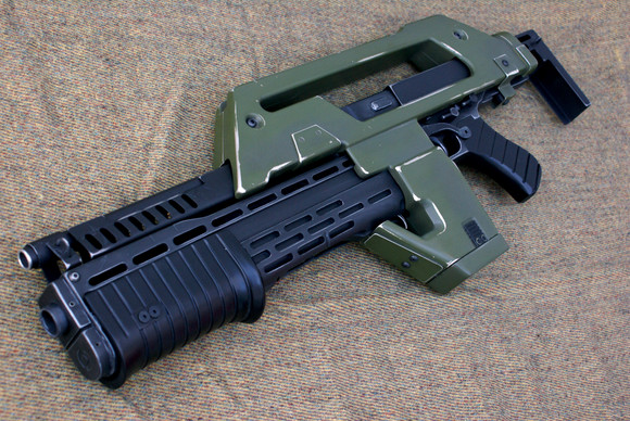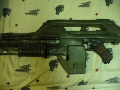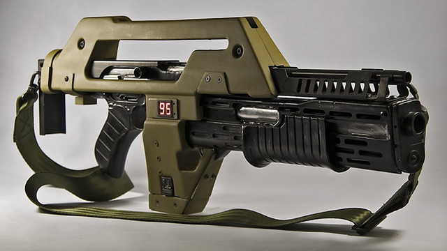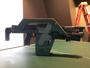The M41A Pulse Rifle from Aliens. I built this some time last year and just haven't uploaded it yet. It was a mammoth effort - if I put all the time that I took building it and smushed it together it probably would have come to about 1 1/2 to 2 weeks worth of work. So many fiddly parts. It's at 1:1 scale, too. Source is [link]Related content