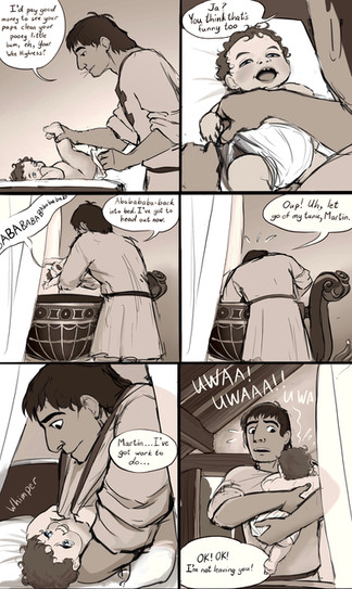 I think I have finally managed to stabilize my depictions of Basil. In this scene he’s ended up looking just like the time I drew the priest that converted Martin. Now I’ve just got to go back and fix his janky face from the comic about Martin’s first word.