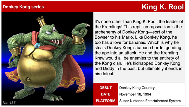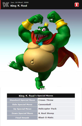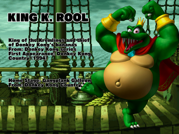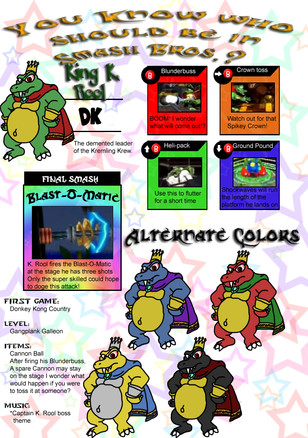 A character MANY had requested in the era of Smash Bros., I decided to add to the villain count.With his appearance, I blended his debut look in the SNES DKC games with his new look in the more recent DS games. I made the crown just big enough to where he can throw it!