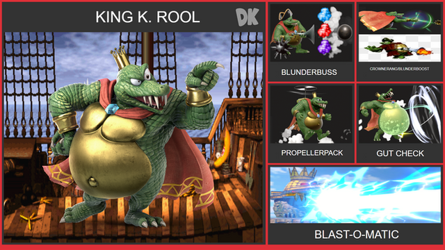 As many would figure, he would use the weapons and inventions throughout his appearances in the DKC series. His crown, blunderbuss, helicopter pack and boxing glove are just few of the moves this big croc can dish out!