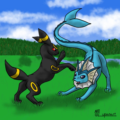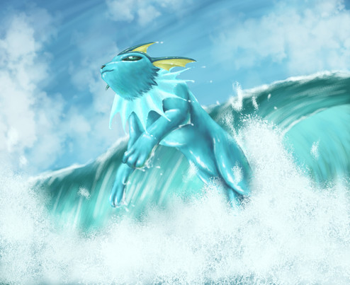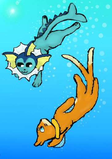 OMG took forever to get this done, i swear it took more than 5 hours!! I started with the buizel because ive wanted to draw one for ages, then I added the vaporeon. At first I did the white parts of the water in block colour but then it occured to me, wtf are you doing, you can use liquify for this. I also tried a new technique i found on a tutorial for waterdrops, they're not great but i think they sort of suit the image. I put lens flare all over them to get that gleam from the sun behind and also to make the buizel look a bit darker as well.I'm doing commisions for