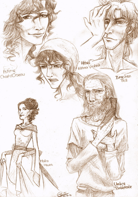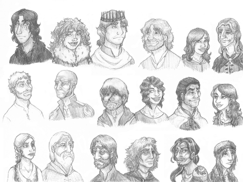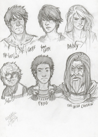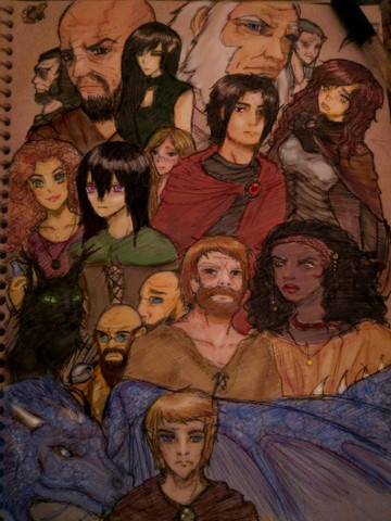 Just some of the main characters in the series. I didnt have room to draw the other dragons, or king orrin really. But its whatevuhAnd everyone with facial hair seems to have the same facial hair. i was planning on giving orik more beard, but i have no idea what happened. I also drew some characters kind of weird, some are younger than they should be. [like Trianna] but yes yes