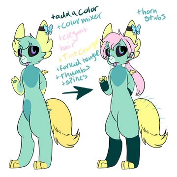 Upgrades: Elegant hair, Cheek fluff, Colored sclera, small horn, Medium feather wings, Feather tail tip, Thumbs, Accessory (hibiscus), Tiny arm wing, Butt fluff, Body fluff, neck fluff, Pupils, Paw pads, Unlimited colors, Unlimited markings (Clover, Band, Rings), Freckles, Baby teeth, Ribbon ears, small back spines