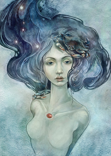 This is amazing. I love how the build of the girl's face is slightly unrealistic, adding to the sharp yet dreamlike quality of this piece. The cap of bubbles, with the two crabs almost completely hiding in it, truly does give the impression of a girl of the sea. As well, I like the detail and obvious amount of effort you put into the girl's hair so that it doesn't get overshadowed by the bubbles, or vice versa. Faving this, and I hope to see more from you in the future.