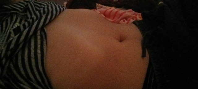 requested a crop top and low rise jeans, stretched out, and an ice cube in my belly button. I tried to fulfill the request! There is indeed an ice cube melting in my navel (chilly!) and I attempted to stretch out my belly by putting some pillows piled up underneath my lower back. My outfit is a pair of low-rise jeans and a striped crop top that shows perhaps two inches of my belly under normal circumstances, and much more (as you can see from the photo) when I'm lying down or stretched out. Because this is one of my nicer crop tops, I usually wear it with jeans and a jacket either when I go out to bars at night.Related content