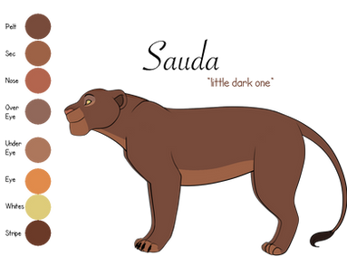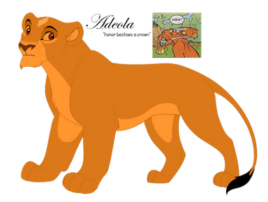 Ade leaves that night, having said farewell to no one. Her father waits for many days, but she does not return. Eventually, another of her sisters is traded in her place. For Ade's part, after a long trek, she ends up in the Pridelands. She is presented to the king, half-starved and sand matting her pelt, but he greets her as kindly as he did any of the princesses courting him. They soon become inseparable despite the substantial age difference. He is kinder to her than any male has ever been, and her spirit impresses him. She is not like the delicate princesses that the other Prides have sent.