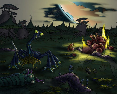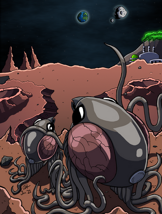 This is so lovably surreal. The designs on the ... aliens? ... is really nifty, along with we well-done shading. Makes me curious as to what happens next!