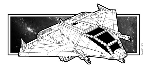 This illustration is my interpretation of the Proctor Long-Range Interceptor from the Phase World setting of the Rifts RPG. I began the project for a player character on Explorers Unlimited's Otherworlds site, who had one of these ships but had no image to use for it.