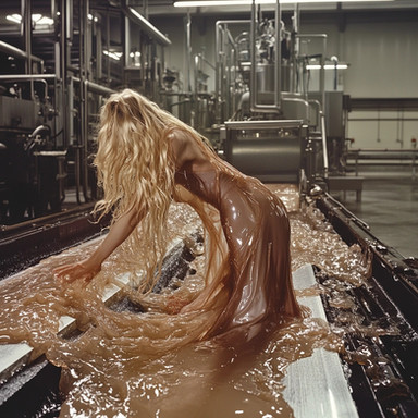 It was Friday and almost everyone had left for the weekend. The only people left were a couple from security on reception and Jane, lead researcher in Lab 2. She’d hung around as she was going out later to meet up with friends. It was time to go, and getting ready to leave, she had taken a shortcut to the locker room through the Wet Vault. This high containment security room was where all of the nannites were kept, held in a liquid latex syrup. As soon as she entered the room, Jane realised that there was a massive problem with the storage vats. Her left foot stuck to a sticky substance on the floor and she stumbled forwards. Falling to the floor, her knees and arms also came into contact with a viscous liquid spill. Looking back she started to panic as she was now kneeling in a pool of orange goo - she knew exactly what this was, how much trouble she was in, and had absolutely no idea what type of nannites were in it. This was particularly dangerous as the latex syrup was the active carrier medium, that would purposely flow over any living matter, and in turn allowed the nannites to enter the body through the skin. ‘Shit,’ she cursed. In a burst of clarity, quick thinking and understanding of just what a predicament she was in, she realised that the only potential escape was to remove her clothes which were all contaminated, move as far clear as possible and await rescue. She pulled off her top, unfastened her shoes and slid out of her trousers. It was however too late, and as she pulled clear, small syruppy strands of the latex stretched up to her skin, having permeated her clothes. Desperately trying to pull these away, just made matters worse, and before long, the liquid was slowly flowing upwards and covering her skin. Escape was futile, like a fly caught in amber, she could only await her fate. Shouting for help was impossible in this most secure room.