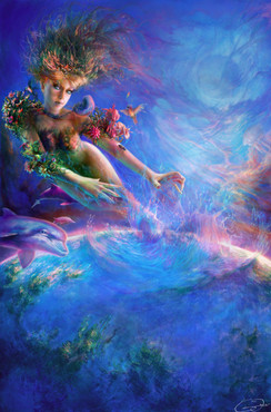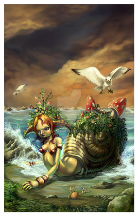 You did a perfect job in every single thing of this picture. The grass and flowers of her hair, the sea in her dress and the fishes, all the birds, the rain, and even the background, it's all so nicely done, it feels like it's all alive.