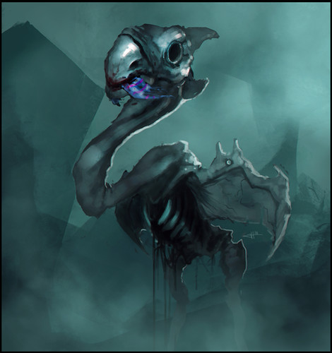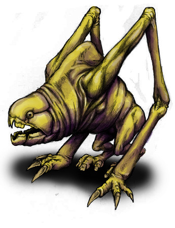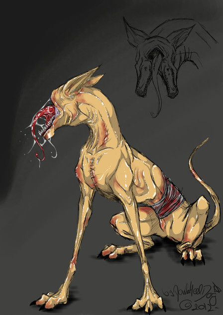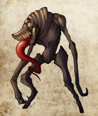 These creatures come out on the darkest night looking for lost travelers , they hide by roads and under bridges. Their tongues is covers in a acids that can easily burn through clothes and skin. If the victim doesn't doesn't die from shock the smell of the acid will act as a lure allowing the Lasher to track them down. ΒA pen drawing I decided to color