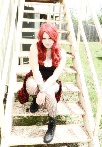I LOVE your corset and boots! And your contacts. Very nice photo. The only criticism I would have is the photographer is reflected behind you. Other than that though, it's really great.