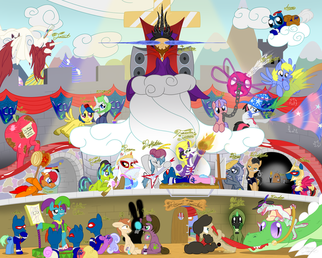 First of all, I must commend you on your originality. Inclusive art like this is actually very rare, as it is hard for most artists to have many things going on at once and still interconnect them. It is a great "snapshot" of ponydom, showing what a "day in the life" is for the denizens of equestria.