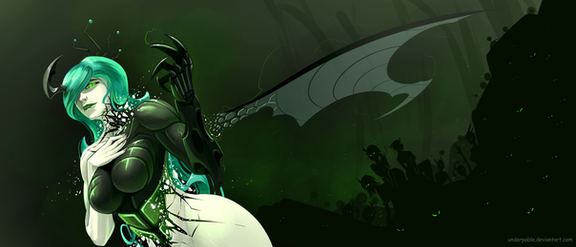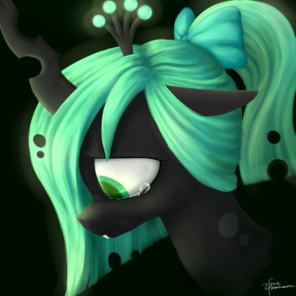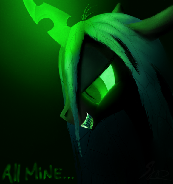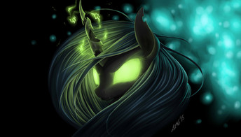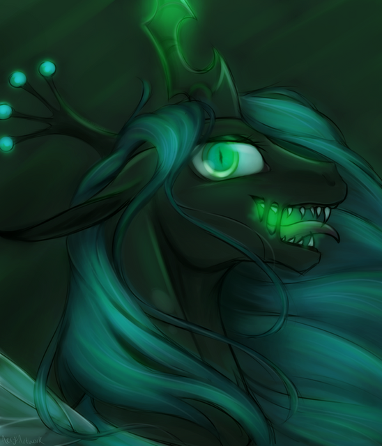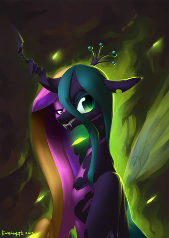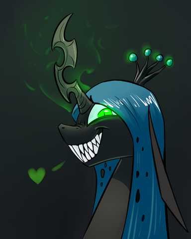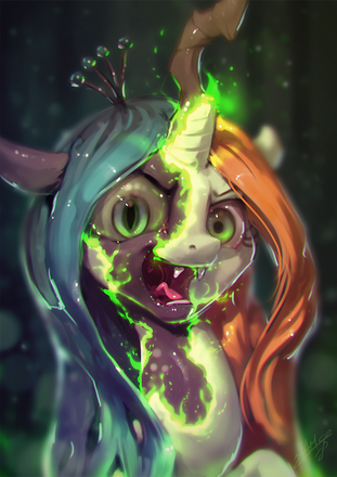 With what little time's available to me right now, I doubt I can do this work the full justice that it deserves, the way the others who first commented on it have. But I absolutely love this pic, and all of its little details. From the ghostly, wispy appearance of Chrysalis' broken horn, to the subtle degrees of shading that cast darkness and reflecting light in believable degrees, to things like the extra length to Chrysalis' jawline and the tears sliding down her cheeks...all of it combines into a picture that depicts a vengeful-yet-broken villain, hiding their pain behind fruitless vows of revenge.