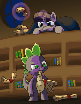 this picture made me laugh so hard i darn near pissed myself, but on a more professional note, the use of lighting is a nice touch the way it contrasts against the dark. not exactly sure why spike's eyes are like that but adds more hilarity. twilights eyes add a touch of innocence to her position. the BG being bland draws more attention toward the picture's action. the desk has nice detail in it and all the letters are nicely stacked in a chaotic fashion. what really sold it was that i could see this happening in an episode like the one where pinkie pie and rainbow dash pranked spike. all in all id give it a 9.9/10, because we all can improve :3