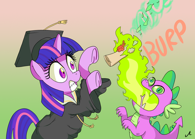 : Oh, sorrysorrysorry Spike! I forgot feeding you those apples gives you indigestion! Next time I'll get you your usual snacks from the take-out window at Sugarcube Corner! Maybe those Linicks Muffins you now like?