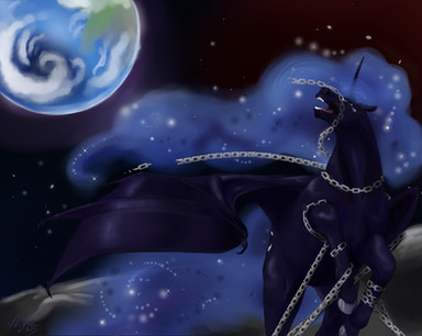 The vision this whole piece gives is incredibly amazing. What I love most is how everything goes together to create the impression that Luna is struggling to break free, and winning. The chains, hair, and posture as well as how distant and far away Earth looks all make Luna appear a powerful mare struggling to escape a distant land. It truly makes her look just like how her personality makes out to be.