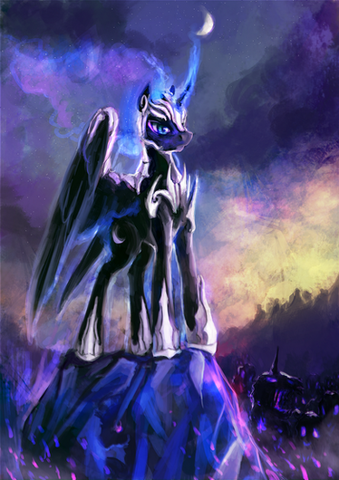 I love your use of color here.You used nightmare moon and changed completely what i thought just through this one picture. I love how you put the details of her mane,the cracks on the moon,and the sky. You as the creator has put millions of tiny details all around this and changed the thought of her being evil into her just wanting to be free and she was only in the need of love. I mean look it never said anything of her being chained down in the story but you still reached in your mind and pulled this out.