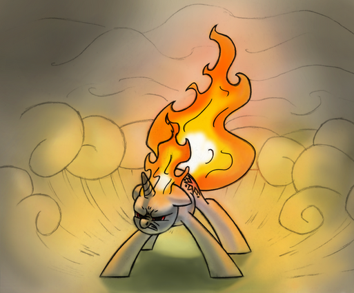 Cursed with dark voodoo magic as a foal, Charred now has an incineration touch that results in all organic matter decaying into smoldering ash through prolonged touch. He was also branded with a grim cutie mark as a result of the curse inflicted on him, that represents this disturbing ability.