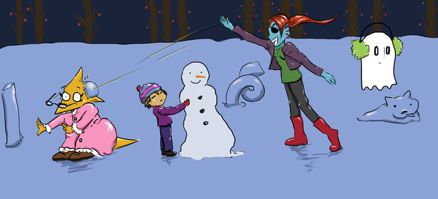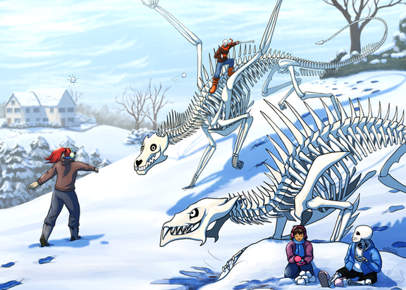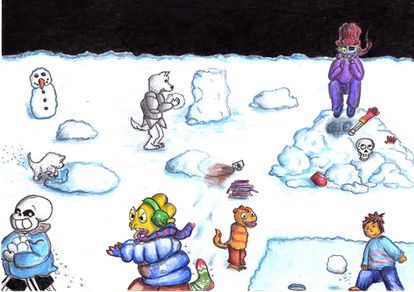 Snowball fights + giant blaster dragons = chaos! This was my gift for the Papchat secret santa--Quill, the recipient, requested the subject, but it honestly feels like a gift for me too because i had a lot of fun coming up with all the shenanigans and drawing everyone having fun. Quill loved it, so Iβm posting it here and sharing it with you all here on DA as well--it's also been cross-posted to my tumblr, eheh.