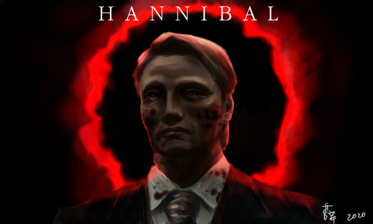 Painted when I was utterly enthralled by series 2 of Hannibal. I wrote a bit about this painting in an interview with ArtRage (creators of the software I used). Here's an extract:"-in the painting of Hannibal Lecter, his appearance is prim, opulent and pleasant – a ‘Person Suit’, as he puts it – so that he can be a functioning member of high society. His narcissist personality is his greatest and most revealing flaw, as such his Person Suit is bleeding out into the long, loud streaks of red paint in the background that symbolise his true murderous nature."