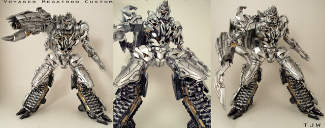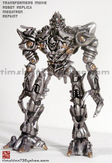 I've done several ROTF Megatrons, from repaints, to murder arm elbow mod and removable sculpted gimp arm hand part version with repaint, to the two non-transforming ones I recently did with the new arm, murder elbow, head mods, and repaint.This is the one I did for myself, but I was unhappy with it being non-transforming so I took it back into the workshop.