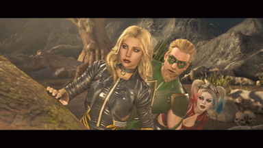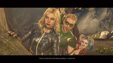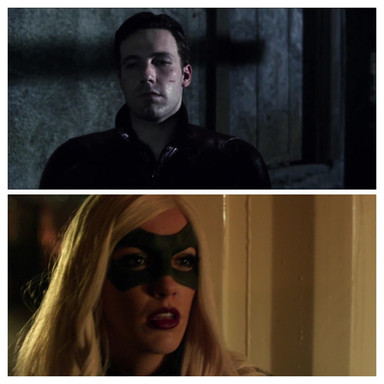 As they spy on Scarecrow and DeadshotHarley, Green Arrow and Black Canary looks at the window