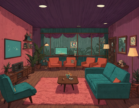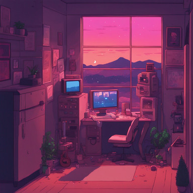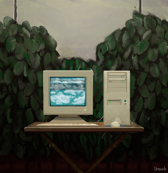 Pintura digital basada en una habitación de computadoras ficticia y ausente de gente ambientado a fines de los 90.