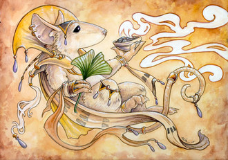I would love to do a series of elemental mice. Heck, I'd love to do a series that included the oft neglected elements from the Chinese system and include wood and metal in the series. But I know myself, and thus will not commit to doing such, because my attention span is short and my schedule is long, and...y'know. More might occur, but I promise nothing.Plus, as a beady-eyed little rationalist who despises pseduoscience in all its incarnations, there is some part of my soul that rises up and mutters "You know that fire and water and earth aren't REAL elements..." and I am then struck with a mad desire to do elemental whatsits that include, oh, Manganese and Hydrogen and Einsteinium and Molybdenum or something. Obviously there's way too much on the periodic table to do them all, and all those short-lived superheavies would tax my creativity after awhile, and I can think of better ways to spend an evening than tearing my hair out trying to find something exciting to painting involving cute fuzzy animals and Samarium. But the desire is still there.