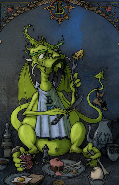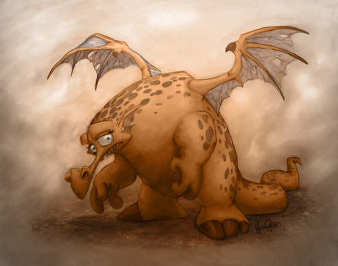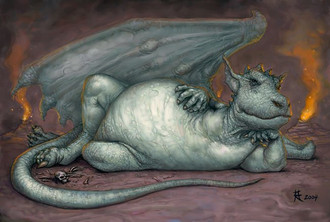 Following a short-lived fad for pet dragons in the Year of the Withered Turnip, and the inevitable injuries and attendant property damage, dragon breeders set out to create a docile domestic lap-dragon. Unfortunately, reckless inbreeding for the desireable traits of placid temper and a diet other than raw meat resulted in low fertility, while failing to deliver the dragon-breeder's Holy Grail of a dwarf lap-dragon. Extensive trapping of wild dragons to improve the strain led to the extinction of wild dragons by the Year of the Gibbering Chipmunk, while domestic dragons grew increasingly fat, sedentary, and omnivorous (although the fertility problem had been fixed entirely too well.) In the end, the dream of lap-dragons was abandoned, and dragons found a new niche as garbage disposals, eating virtually every form of organic trash and converting it to high grade fertilizer. Attempts by the well-meaning to coax the morbidly obese and slothful dragons into a healthier lifestyle revealed that in fact, dragons were perfectly content to sleep twenty-three hours a day and have their food delivered, and had a regrettable tendency to convert anyone attempting to alter their lifestyle into mulch by the most direct route.Related content