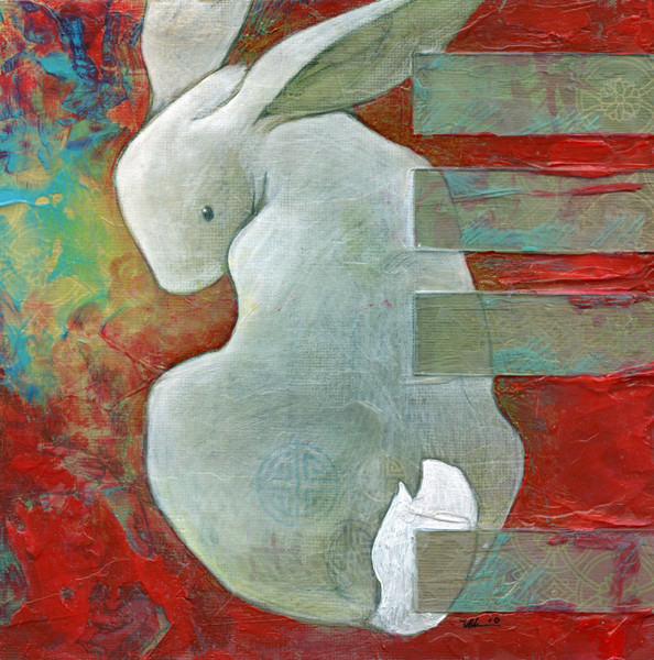 I keep revisiting this theme...one of the few images where I just have the desire to play with variations on the basic shape over and over. This one was done over collaged strips of manga and has some weird faces and eyeballs and occasional exclamations in kanji peeking through the paint. Now that it's done, I keep thinking it needed to be bigger--the compositions on these seem to work better when they're almost filling the panel. Oh well, that's why it's a series...12 x 16 mixed media on panel. Original is for sale, prints are available--you can get prices for both at Red Wombat Studio: [link]