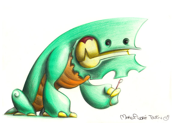 Another of the little pieces done for AC, this time of a happy pink lizard and his fly-encrusted ice cream...Original sold, prints available for $10 plus shipping, send a note or visit [link] for details.